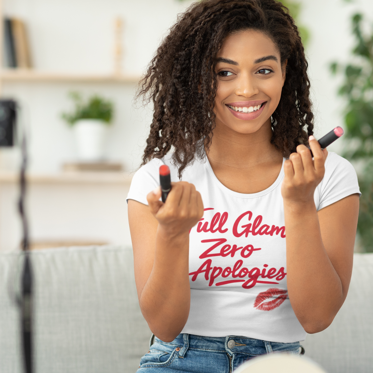 The Full Glam, Zero Apologies crewneck t-shirt is for anyone who treats getting dressed like an event and living loudly like a right. Inspired by big personalities, bigger confidence, and unapologetic, camp-forward glamour, this tee is a celebration of showing up fully and without regret.