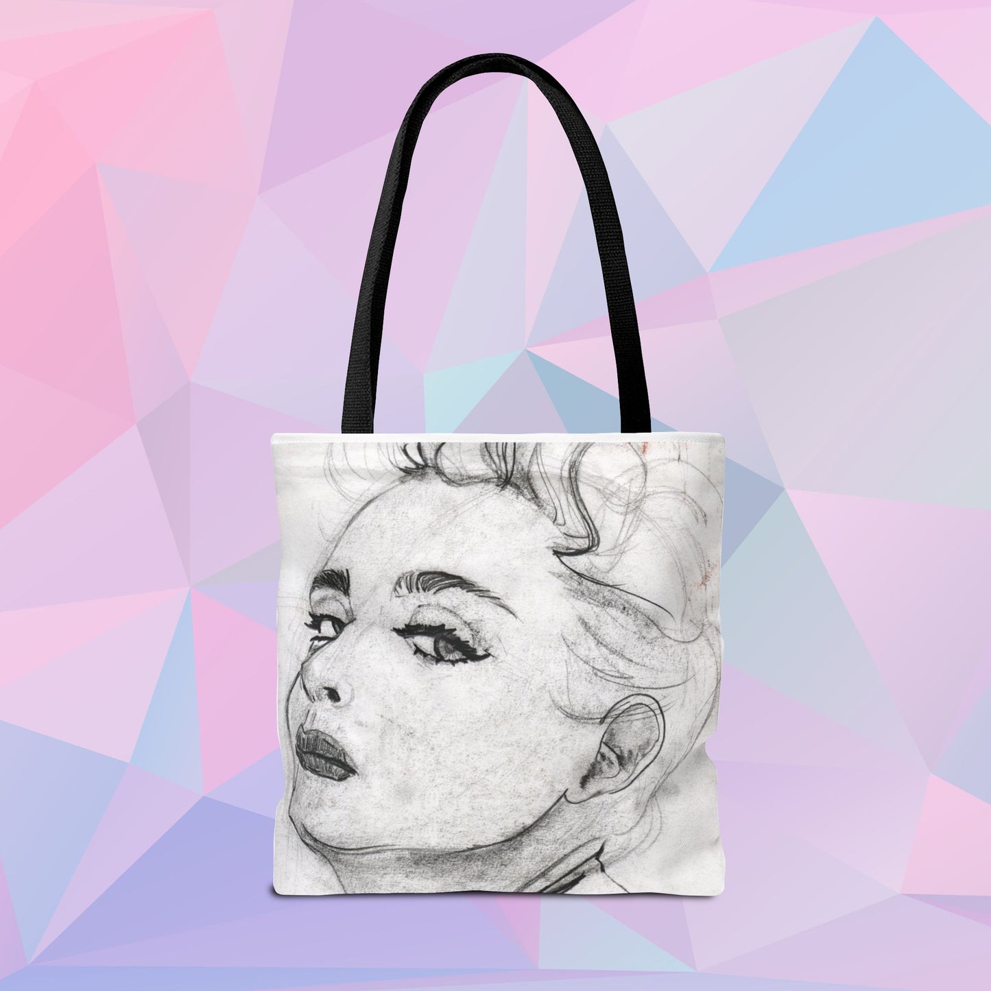 Available in three sizes, this custom-printed tote provides ample space while adding that bold, vintage flair. With multiple handle color options to choose from, you can make it your own. Made with spun polyester, double-stitched seams, and cotton webbing straps, it's designed for durability and comfort, while the nonwoven laminate lining keeps it strong for all your adventures. The dye sublimation process ensures the crisp, eye-catching illustration stays vibrant and sharp—just like Madonna herself.