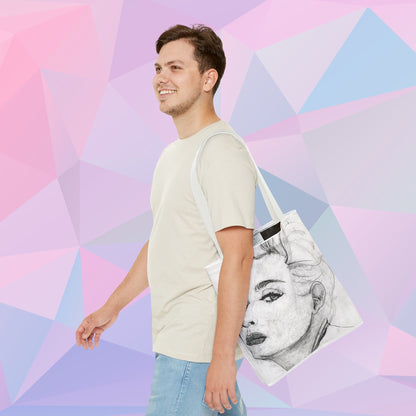 Step into the world of pop royalty with the Living in a Material Tote! Featuring a stunning black-and-white, charcoal illustration of Madonna in her iconic 1980s glory, this tote celebrates the queen of reinvention herself. Whether you're out shopping or strutting your stuff, this tote is the perfect accessory to keep your essentials stylishly in check, just like Madge. 💅